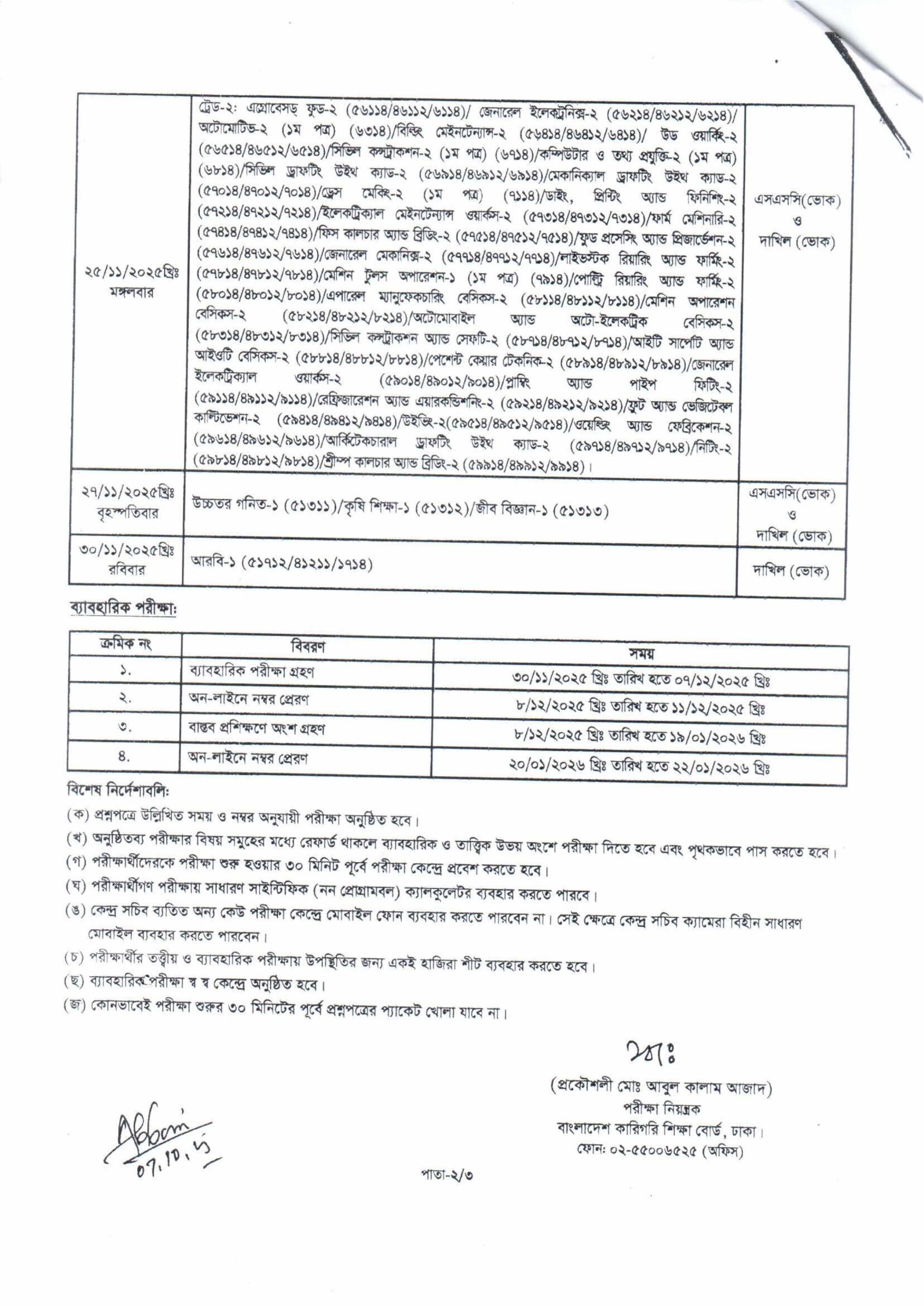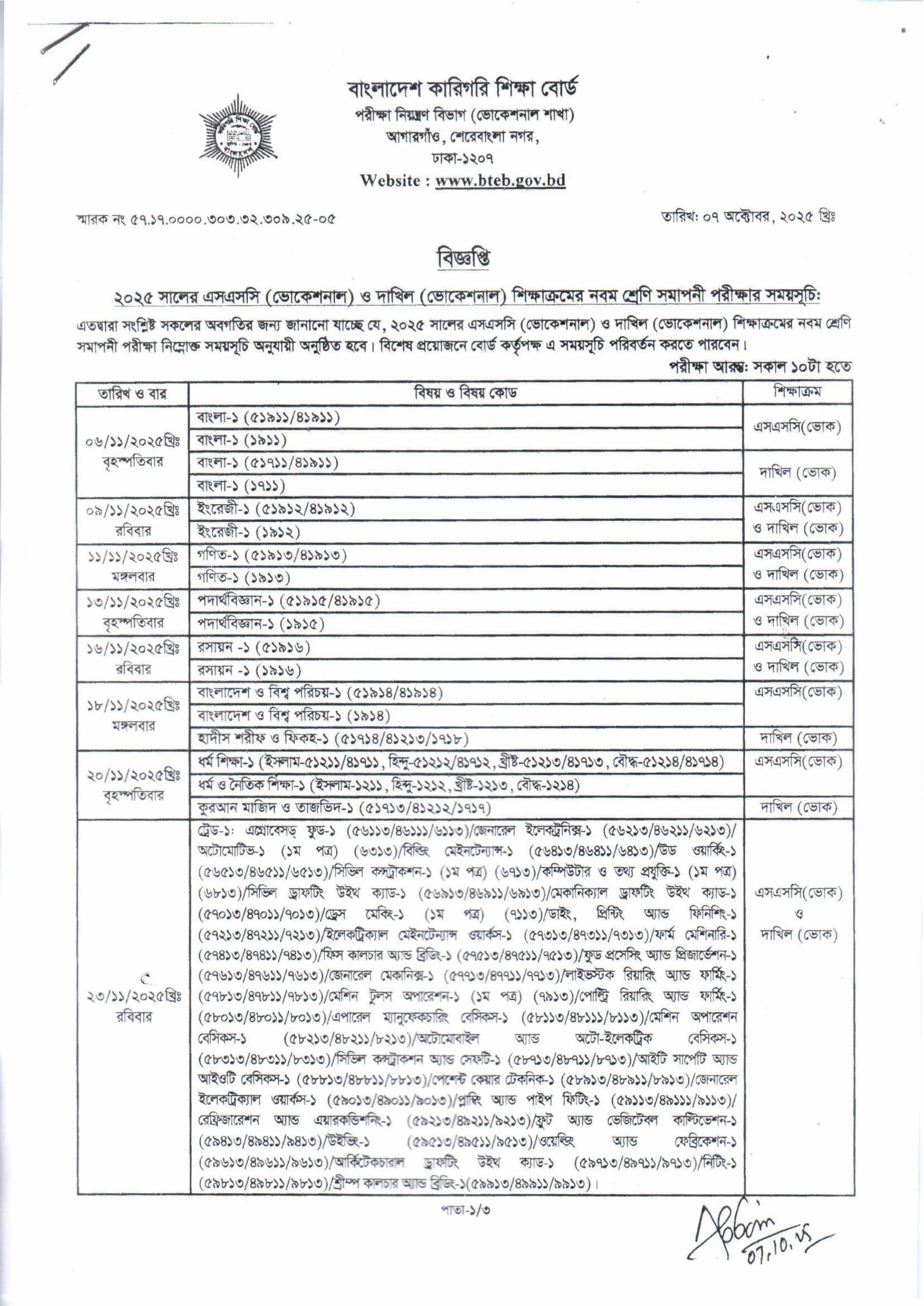 ২০২৫ সালের এসএসসি (ভোকেশনাল) শিক্ষাক্রমে নবম শ্রেণি সমাপনী পরীক্ষার সময়সূচি প্রকাশ